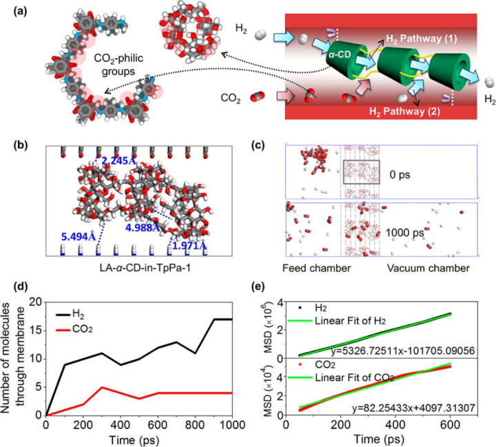 通过分子动力学模拟(MD)深入研究了LA-α-CD-in-TpPa-1膜的气体分离机制,重点分析了H₂和CO₂在膜中的传输行为。